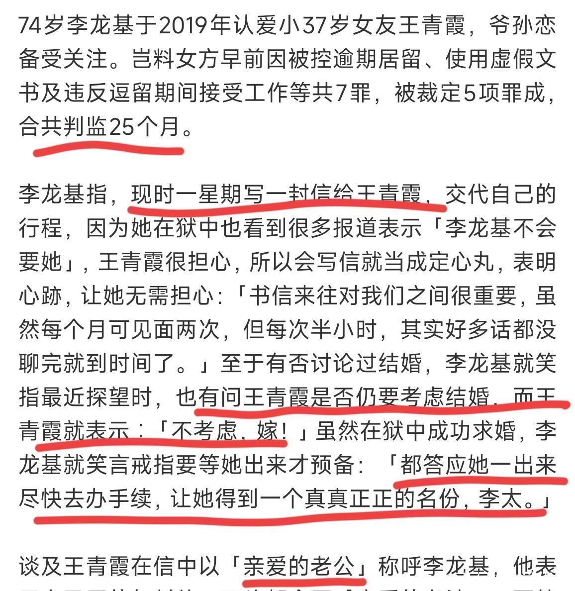 古稀之年的李龙基原以为自己在黄昏时期找到了属于自己的幸福,哪怕王青霞因为犯罪被判监禁25个月,李龙基依旧对对方不离不弃,与王青霞通信两人互诉衷肠,更是在去年在狱中向对方求婚,两人更是早已经用老公老婆互相称呼。
