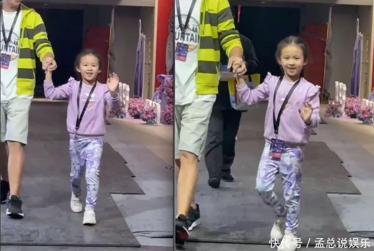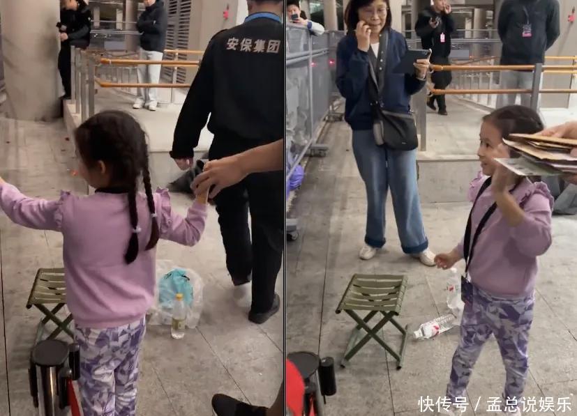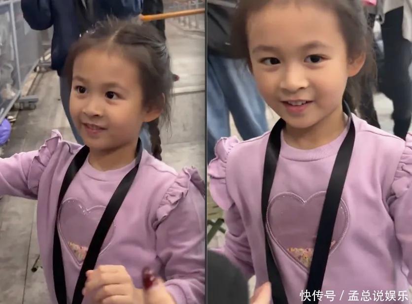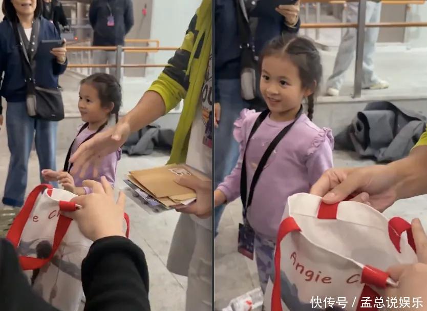 从演出后台出来的她身穿紫色衣服,像个小花童一样,面对众人的围观一点也不怯场,大大方方的接收粉丝们递过来的卡片。